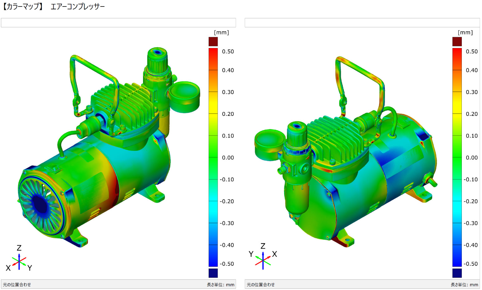 ・現物(3Dスキャンデータ)と3DCADデータ(3Dリバースデータ)の偏差をカラーマップにて確認。