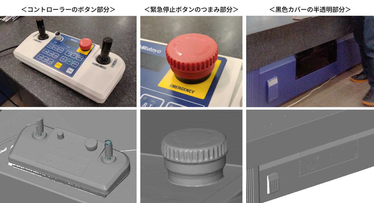 コントローラーのボタンの凹凸形状や緊急停止ボタンのつまみの入り組んだ形状等の細かな形状につきましては、撮影モードを切り替えて詳細なスキャンを行いました。